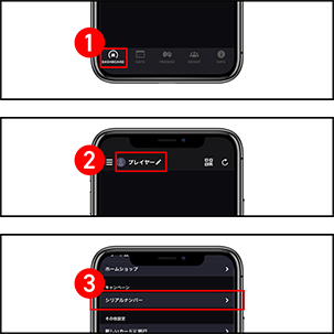 アプリを開き、「DASHBORD」→「カード名をタップ」→「シリアルナンバー」